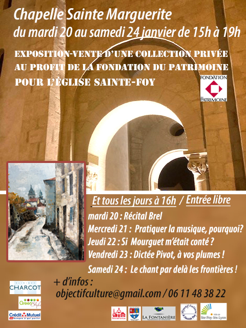 Objectif-Culture à Sainte-Foy organise pour la Fondation du patrimoine une exposition-vente à la chapelle Sainte-Marguerite tous les après-midis du 20 au 24 janvier de 15h à 19h, au profit de la restauration de l’église Sainte-Foy.